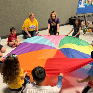 ELA Group: Model to families how to use wordless picture books with the use of an interpreter and use realia to support learning. We played a parachute game and bounced different balls on our parachute which we had seen in our wordless picture book, and played catch. We also modeled language skills while doing these activities. We discussed which balls were large or small, which would bounce high, which would be heavy or light to catch, etc.